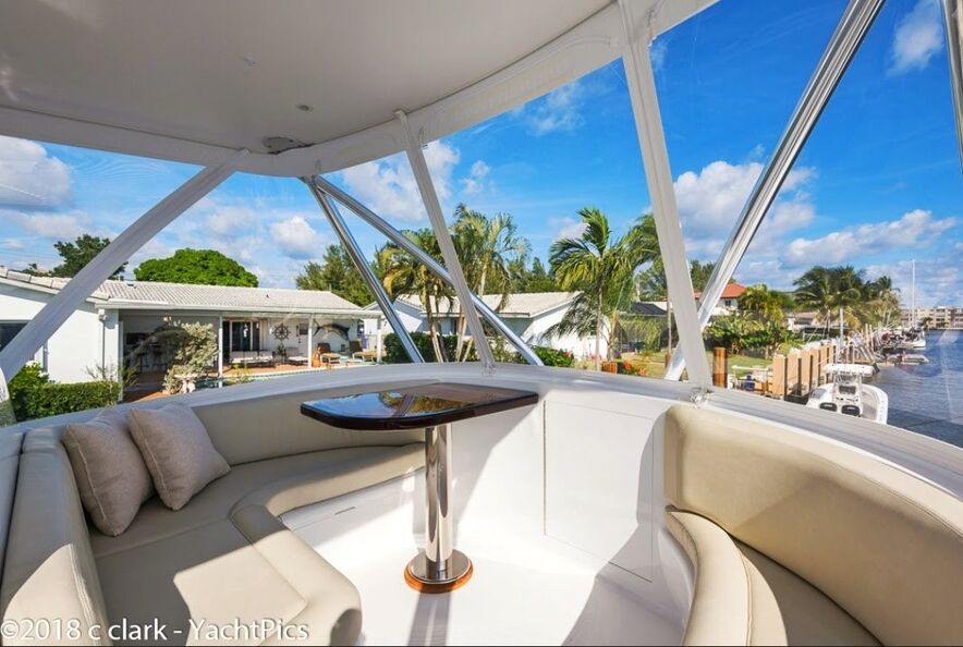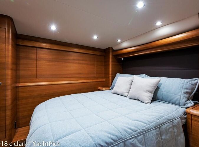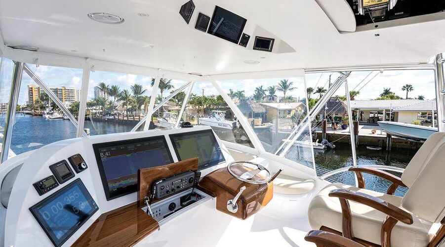 Her bridge is outfitted with Miya Epoch US 9HD teaser reels that are recessed in the hardtop, and an aft-facing 10-inch Garmin display is mounted aft of the teaser reel box. Her console features a teak helm pod and two flush-mounted 24-inch Garmin monitors with an additional 12-inch display to port.