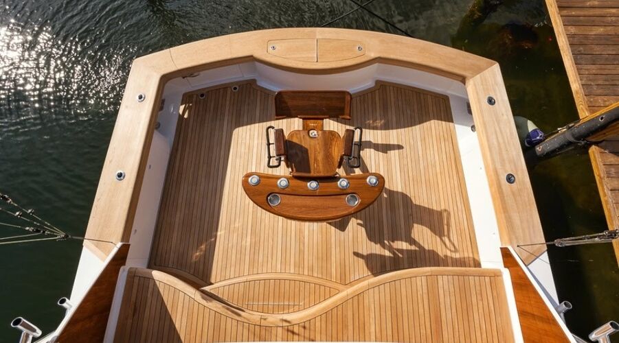 A shapely mezzanine contains a large freezer under the seat, dual freezers under the step to port, lift-up engine-room access on the centerline, and a large drink box under the step at the salon door entrance. And below that, at the first step, there’s another storage area with drains to accommodate lead weights. To starboard of the salon door entrance is a built-in cabinet with a hidden electric grill and stainless-steel ice-machine dump box under the step.