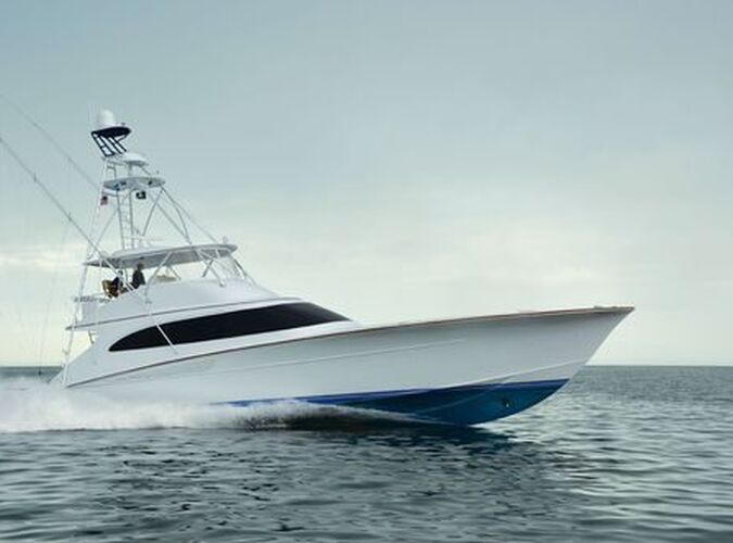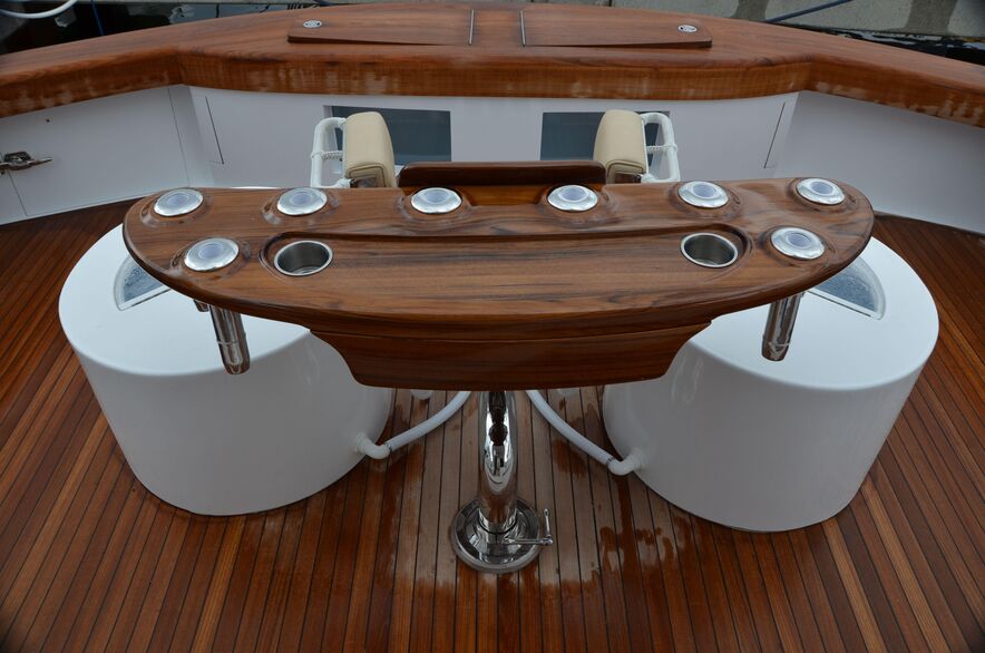Despite her head-turning good looks, her design, shape and profile are first and foremost based on her intended purpose. Low, sleek, and appearing as if in constant motion, she is in perfect proportion to her length. Whether viewing her landing strip foredeck, the gentle slope of the house with its familiar black brow or the open bridge design with its massive and fully functional Palm Beach tower, everything about De Bait Able is in harmony and balance. And even up on the bow, her removable casting station and flush-mounted livewell make sense.