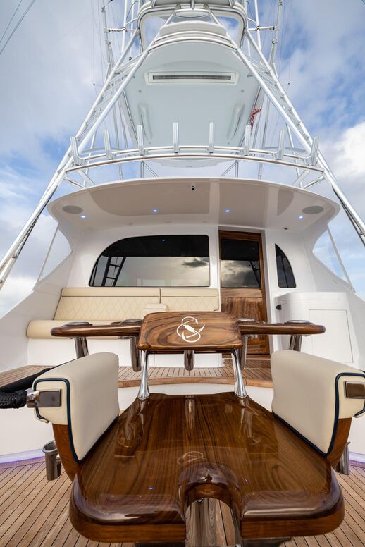 The classic straight lines of the teak cockpit boards tame the curvy, signature F&S radial mezzanine and transom livewell. A giant lazarette is accessible by way of a Freeman Marine deck hatch located under the chair’s footrest and ensures safe, dry storage below for the multitude of systems located there.