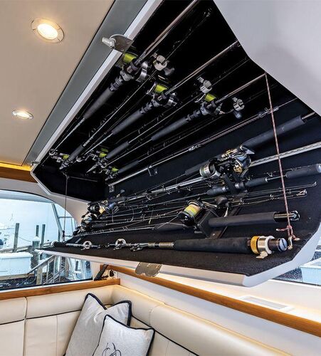The 120-square-foot cockpit deck easily fits the large fighting chair with an offset pedestal and on-deck tuna tubes—essential when you plan on fighting some of the monsters living near the rigs in the Gulf of Mexico.