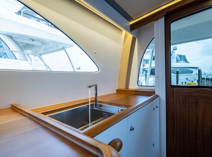 The design team created a 6-foot-8-inch character named Fred within the CAD program, who would be moved around the virtual boat to be sure proper clearance of areas such as the companionway, staterooms and showers. Fred was also integral to helm line-of-sight—both while running and to the angler in the fighting chair. And because the interior space is directly connected to all the exterior dimensions, it was necessary to consider every detail.