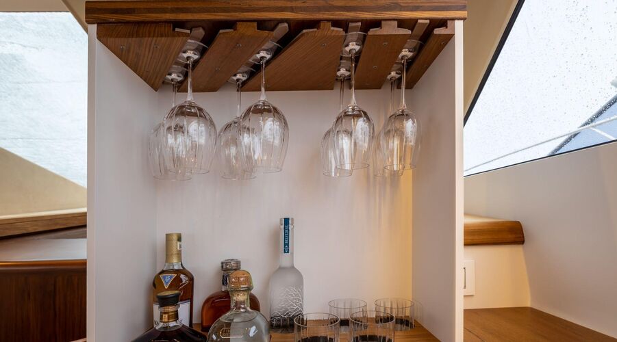 The bright interior of the helm deck is striking. The express design allows for a view of the world around her, and F&S takes the “view” to new levels by incorporating one giant piece of custom curved glass on each side. By doing so, there is little to break that uninterrupted sightline, providing a true, 360-degree perspective.