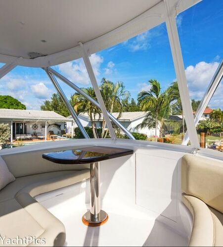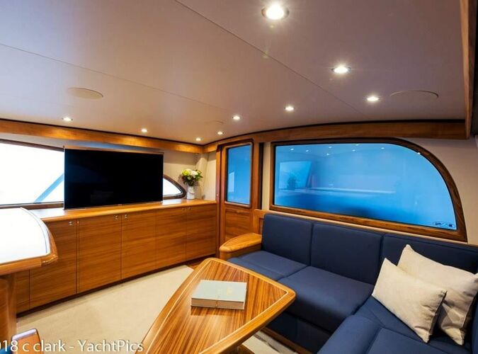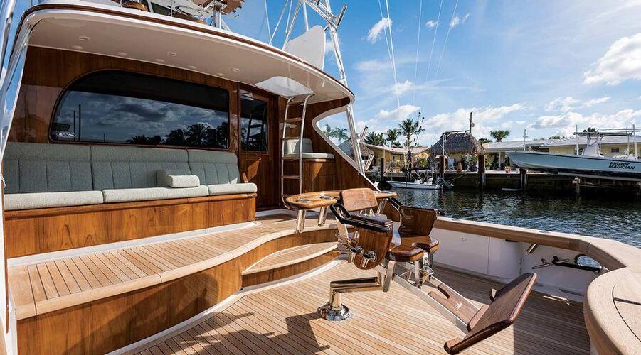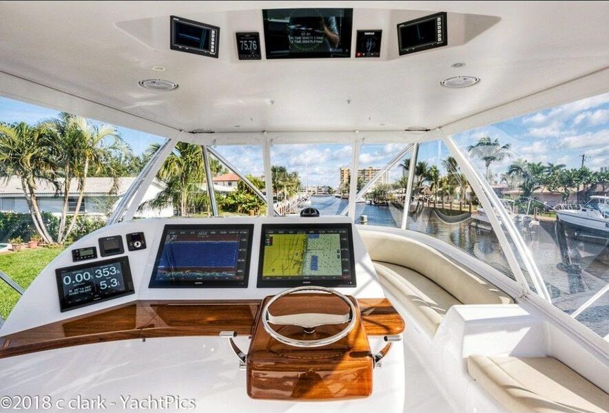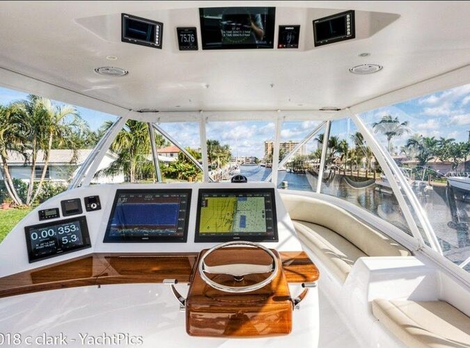 Her bridge is outfitted with Miya Epoch US 9HD teaser reels that are recessed in the hardtop, and an aft-facing 10-inch Garmin display is mounted aft of the teaser reel box. Her console features a teak helm pod and two flush-mounted 24-inch Garmin monitors with an additional 12-inch display to port.