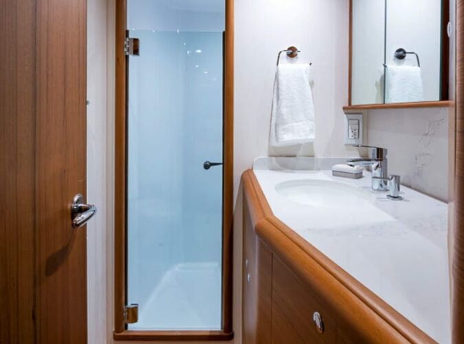 Esme’s galley is well-laid-out, with four undercounter refrigeration drawers. On the forward bulkhead, cabinets house a Miele coffee-/espresso-maker, a convection microwave oven, and plenty of additional storage; a large sink is outboard under the forward cabinet. And behind the galley cabinets is a large storage and electrical room housing the boat’s audio-visual equipment and the other ship systems.
