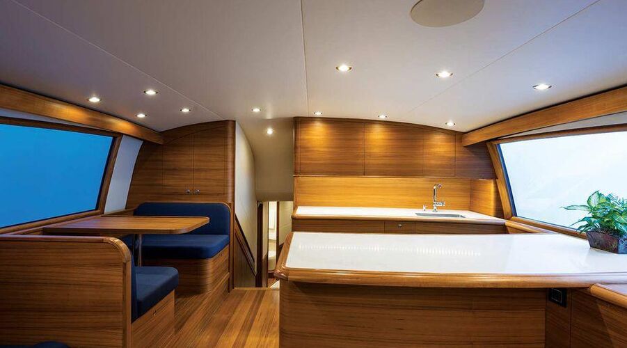 A shapely mezzanine contains a large freezer under the seat, dual freezers under the step to port, lift-up engine-room access on the centerline, and a large drink box under the step at the salon door entrance. And below that, at the first step, there’s another storage area with drains to accommodate lead weights. To starboard of the salon door entrance is a built-in cabinet with a hidden electric grill and stainless-steel ice-machine dump box under the step.