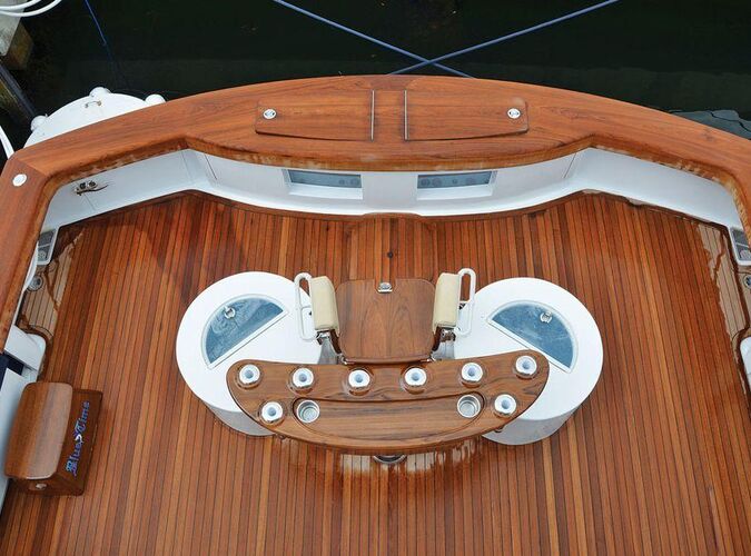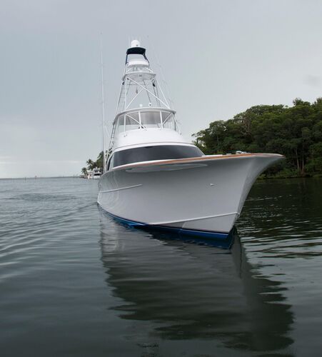 Despite her head-turning good looks, her design, shape and profile are first and foremost based on her intended purpose. Low, sleek, and appearing as if in constant motion, she is in perfect proportion to her length. Whether viewing her landing strip foredeck, the gentle slope of the house with its familiar black brow or the open bridge design with its massive and fully functional Palm Beach tower, everything about De Bait Able is in harmony and balance. And even up on the bow, her removable casting station and flush-mounted livewell make sense.