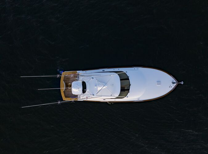 The design team created a 6-foot-8-inch character named Fred within the CAD program, who would be moved around the virtual boat to be sure proper clearance of areas such as the companionway, staterooms and showers. Fred was also integral to helm line-of-sight—both while running and to the angler in the fighting chair. And because the interior space is directly connected to all the exterior dimensions, it was necessary to consider every detail.