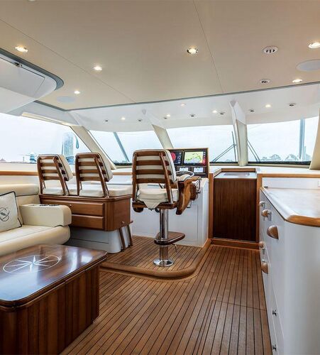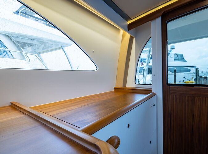 The bright interior of the helm deck is striking. The express design allows for a view of the world around her, and F&S takes the “view” to new levels by incorporating one giant piece of custom curved glass on each side. By doing so, there is little to break that uninterrupted sightline, providing a true, 360-degree perspective.