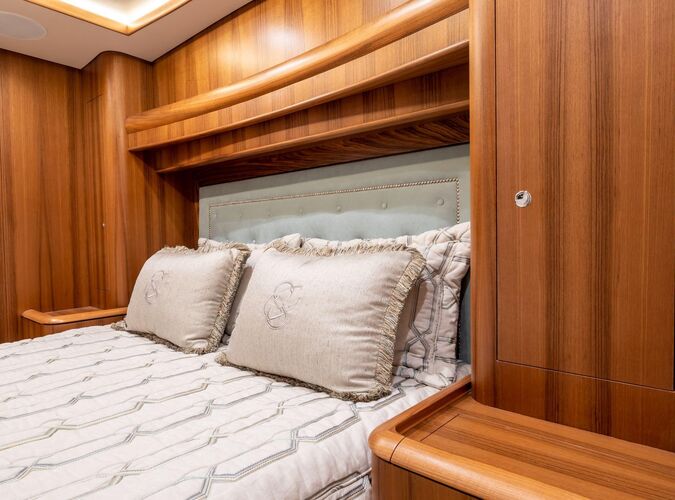 The classic straight lines of the teak cockpit boards tame the curvy, signature F&S radial mezzanine and transom livewell. A giant lazarette is accessible by way of a Freeman Marine deck hatch located under the chair’s footrest and ensures safe, dry storage below for the multitude of systems located there.